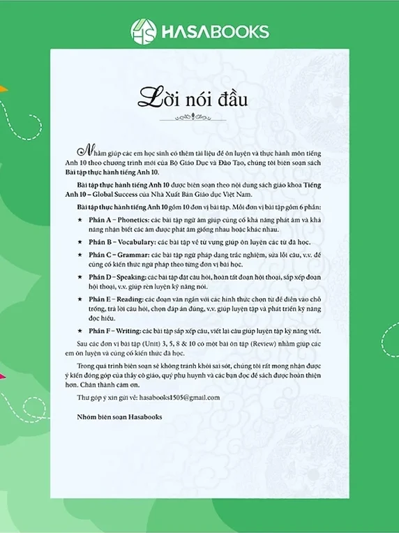 Bài tập thực hành tiếng Anh 10 được biên soạn theo nội dung sách giáo khoa Tiếng Anh 10 – Global Success của Nhà Xuất Bản Giáo dục Việt Nam.