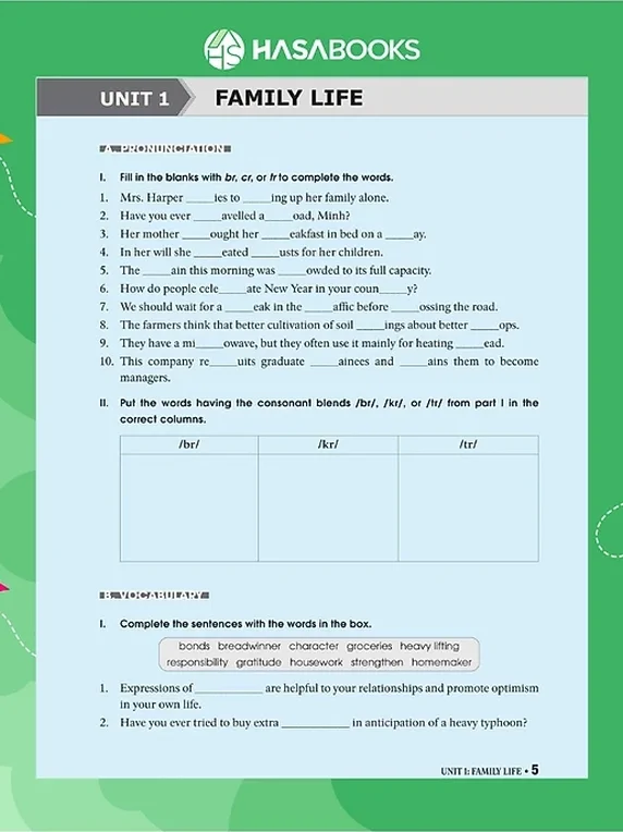 - Phần D – Speaking: các bài tập đặt câu hỏi, hoàn tất đoạn hội thoại, sắp xếp đoạn hội thoại, giúp rèn luyện kỹ năng nói.