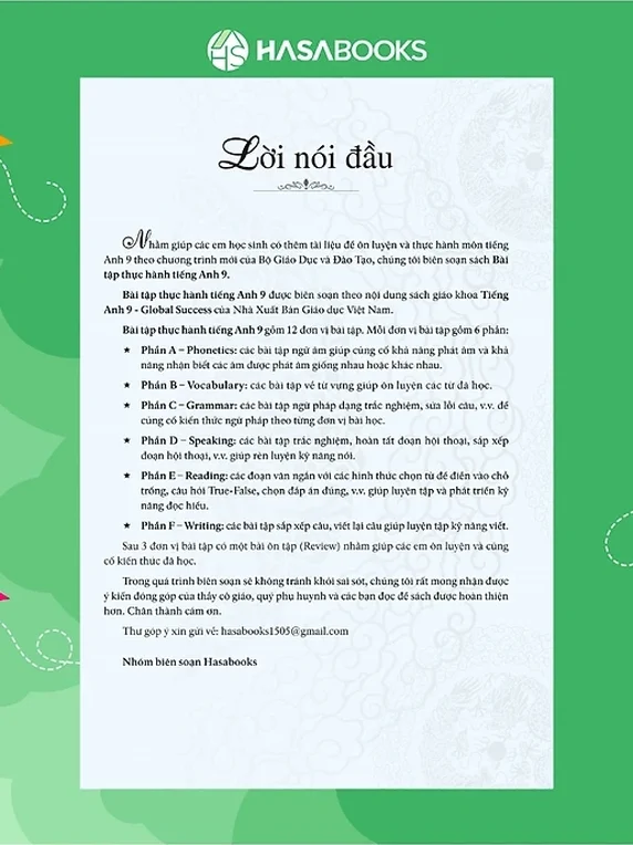 Bài tập thực hành tiếng Anh 9 được biên soạn theo nội dung sách giáo khoa Tiếng Anh 9 − Global Success của Nhà Xuất Bản Giáo dục Việt Nam.