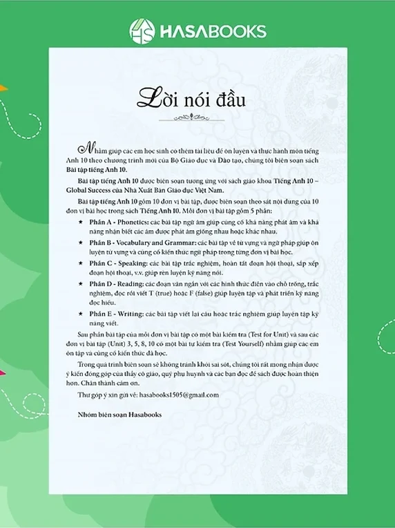 Sách Bài tập tiếng Anh 10 được biên soạn bám sát với sách giáo khoa Tiếng Anh 10 − Global Success của NXB Giáo dục Việt Nam.