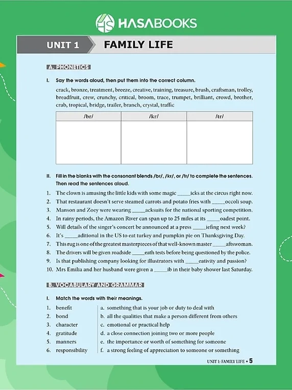Bài tập tiếng Anh 10 gồm 10 đơn vị bài tập, mỗi đơn vị gồm 5 phần: Phonetics (phát âm), Vocabulary and Grammar (từ vựng và ngữ pháp), Speaking (kỹ năng nói), Reading (đọc hiểu), Writing (kỹ năng viết).