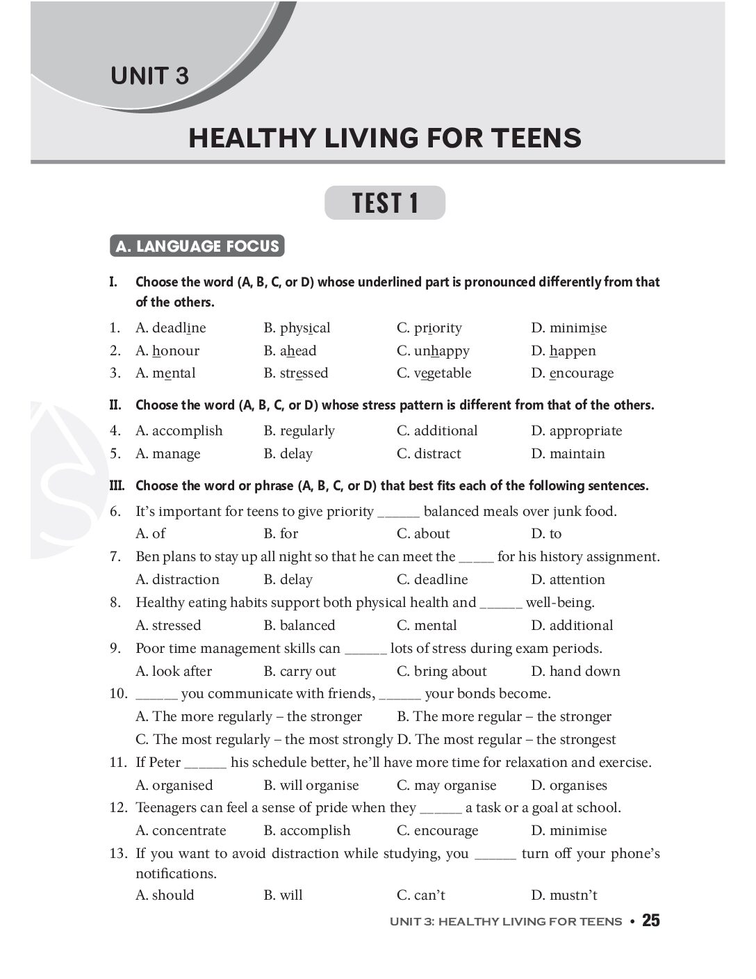 24 đề kiểm tra (Tests) tương ứng với 12 đơn vị bài học trong sách giáo khoa: củng cố kiến thức của từng đơn vị bài học, giúp học sinh chuẩn bị cho bài kiểm tra 15 phút.