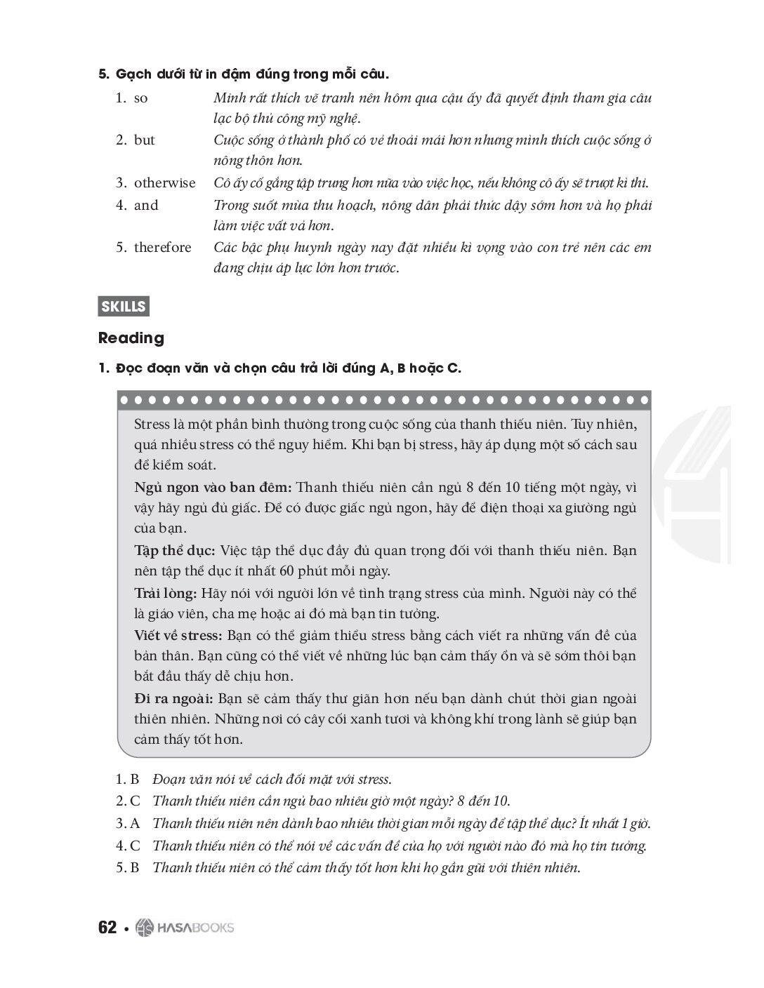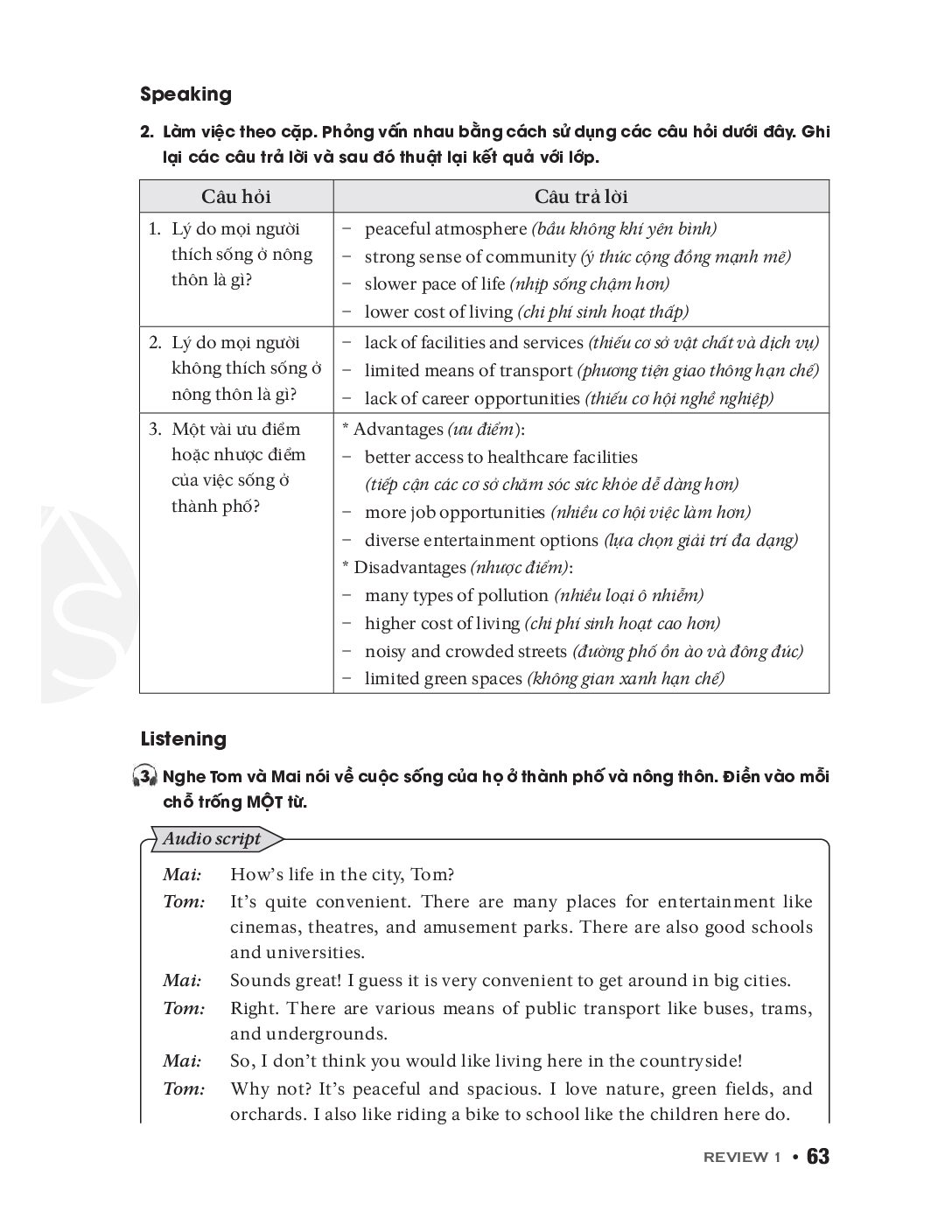 + Bài giải và bài dịch (Solutions & Translations): Để tăng tính hiệu quả của việc học tiếng Anh, học sinh cần giành thời gian tự làm bài tập và nghe đĩa CD trước khi tham khảo phần này để không phụ thuộc vào phần giải thích trước trong sách, nhằm đánh giá khả năng nghe hiểu, đọc hiểu của mình và có lộ trình khắc phục. Trong phần này, chúng tôi giải thích chi tiết các bài nghe, giải thích và dịch tất cả các bài hội thoại, bài đọc trong sách giáo khoa.