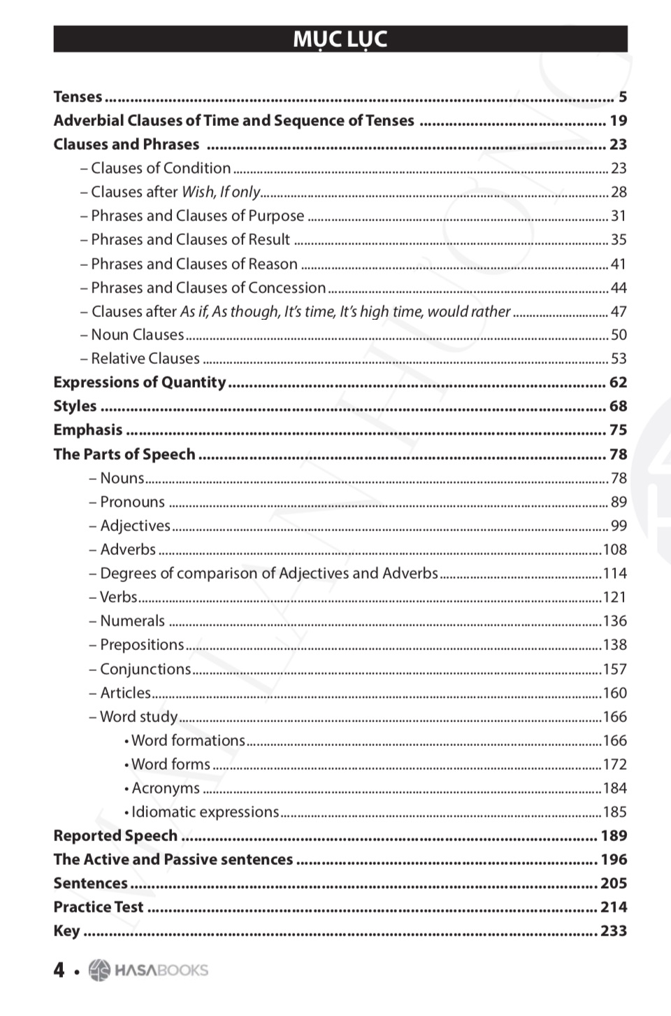 Sách tổng hợp 10 chủ điểm ngữ pháp trọng yếu mà các em học sinh cần nắm vững: Tenses (Thì); Adverbial Clauses of Time and Sequence of Tenses (Mệnh đề trạng ngữ chỉ thời gian và sự phối hợp thì); Clauses and Phrases (Mệnh đề và cụm từ); Expressions of Quantity (Từ chỉ số lượng); Styles (Văn phong); Emphasis (Dạng nhấn mạnh); The Parts of Speech (Từ loại); Reported Speech (Lời nói gián tiếp); The Active and Passive Sentences (Câu chủ động và câu bị động); Sentences (Câu).